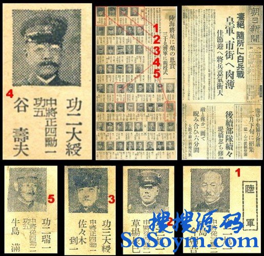 • 昭和十五年二月十一日,1940年2月11日日本大阪《朝日新闻》报道 谷寿夫、中岛今朝吾、牛岛满、草场辰巳、佐佐木到一等, 因攻占南京有“功”,天皇恩赏绶勋,这些都是日寇极为可耻的铁证!